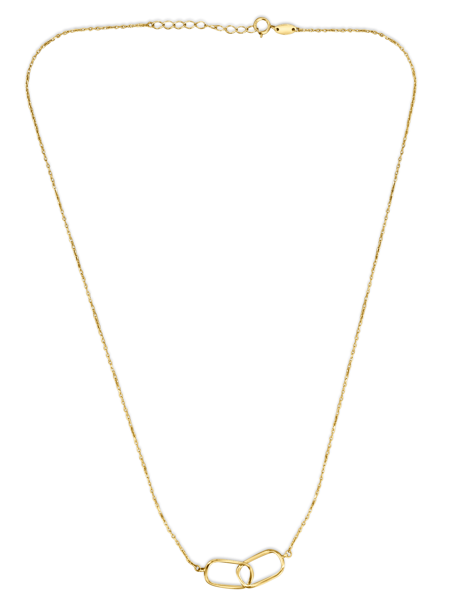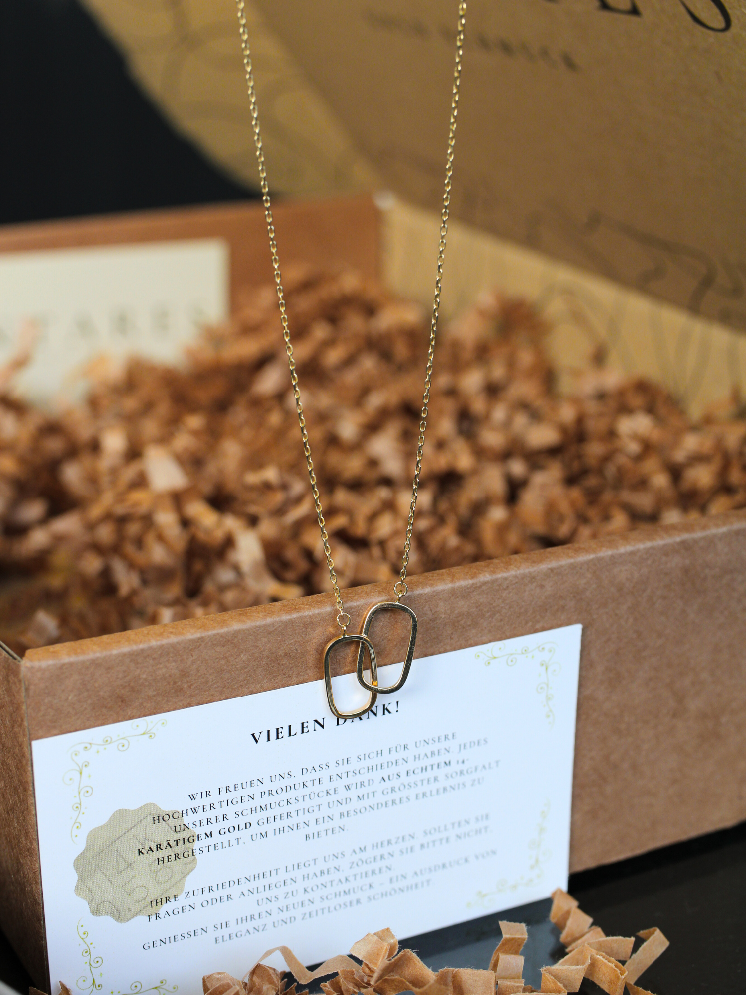 Diese elegante Halskette aus 14K (585er) Echtgold kombiniert modernes Design mit symbolischer Bedeutung. Der Anhänger besteht aus zwei ineinandergreifenden, rechteckigen Formen, die für Verbundenheit, Zusammenhalt und Stabilität stehen.