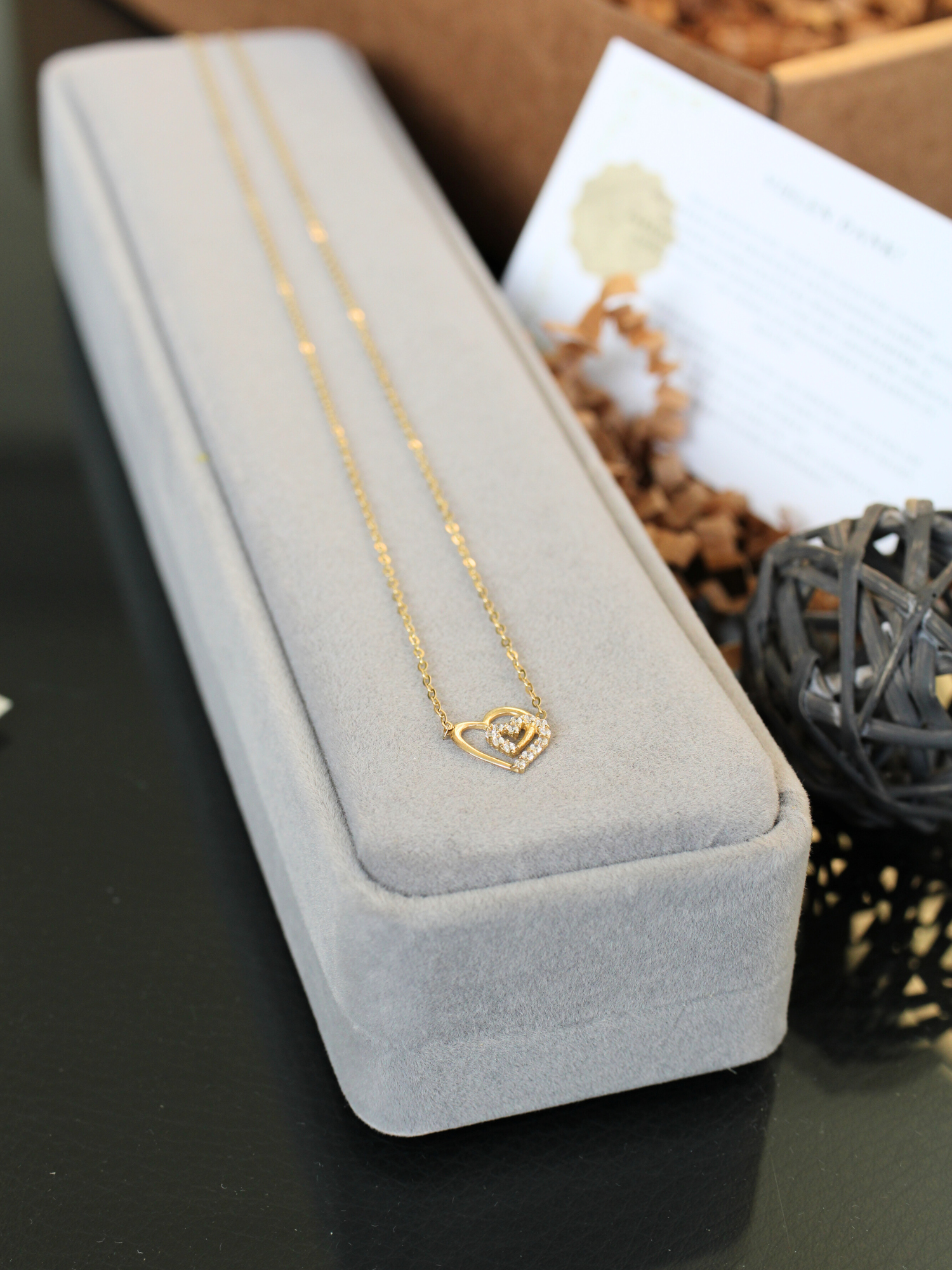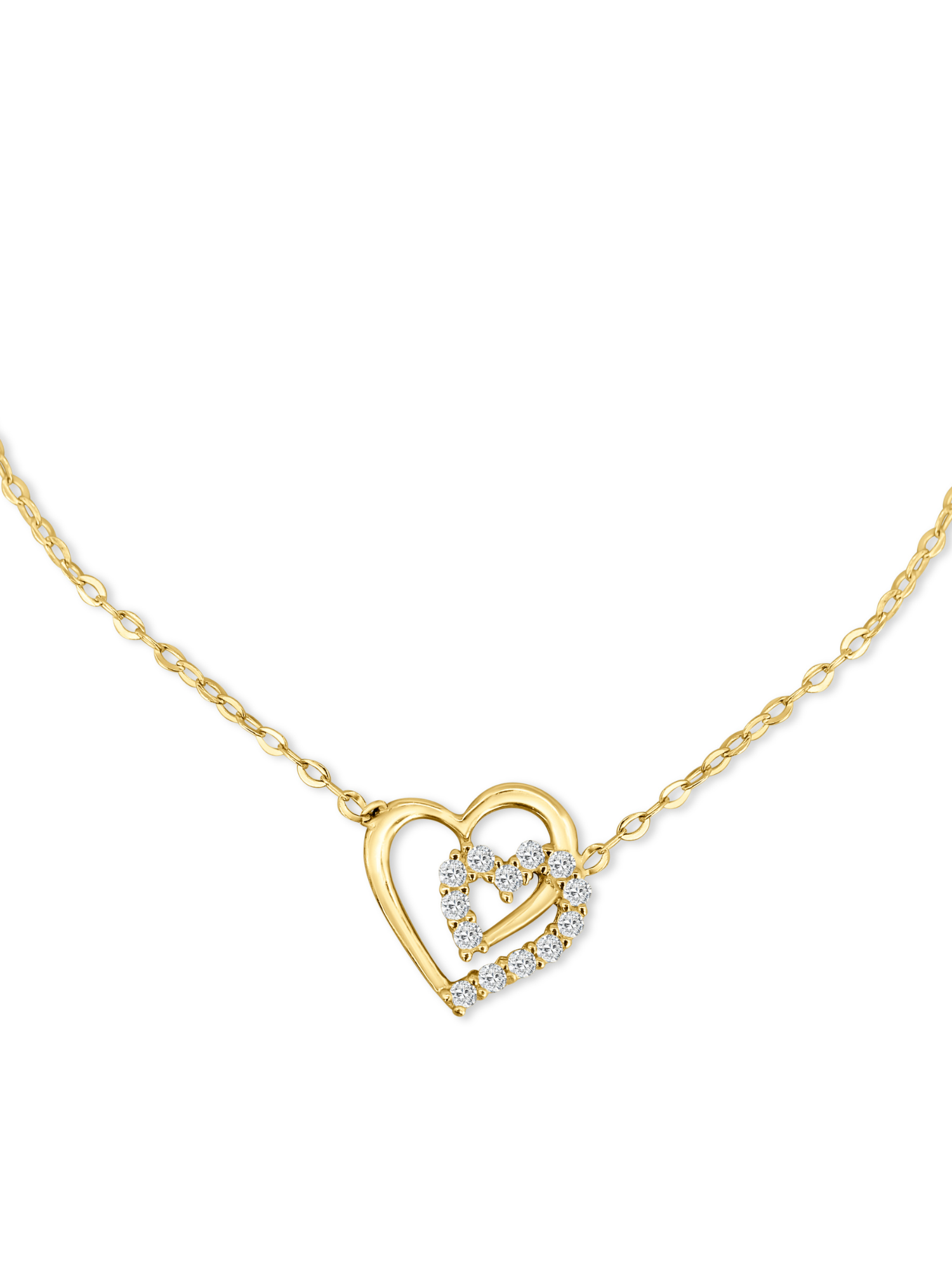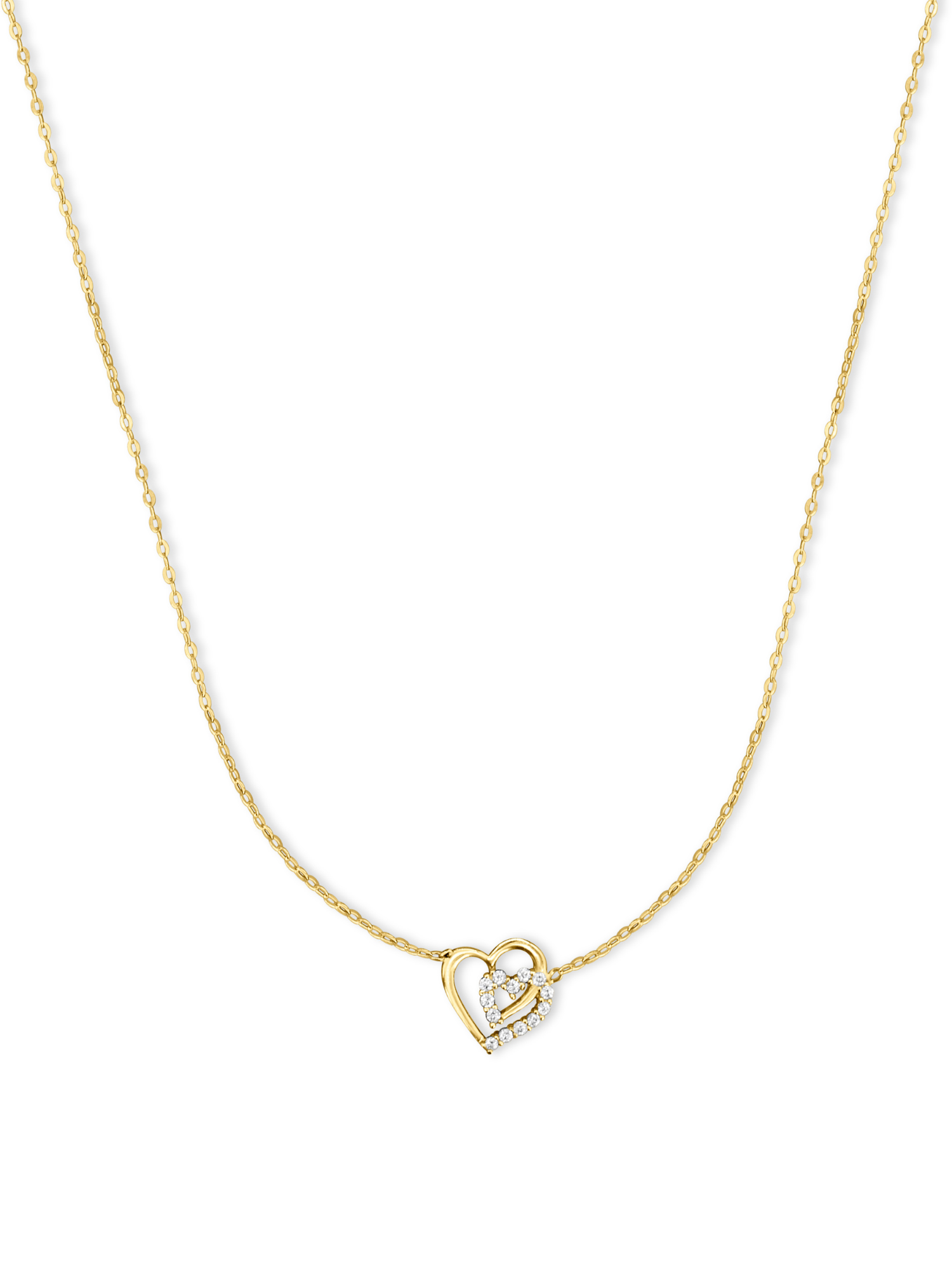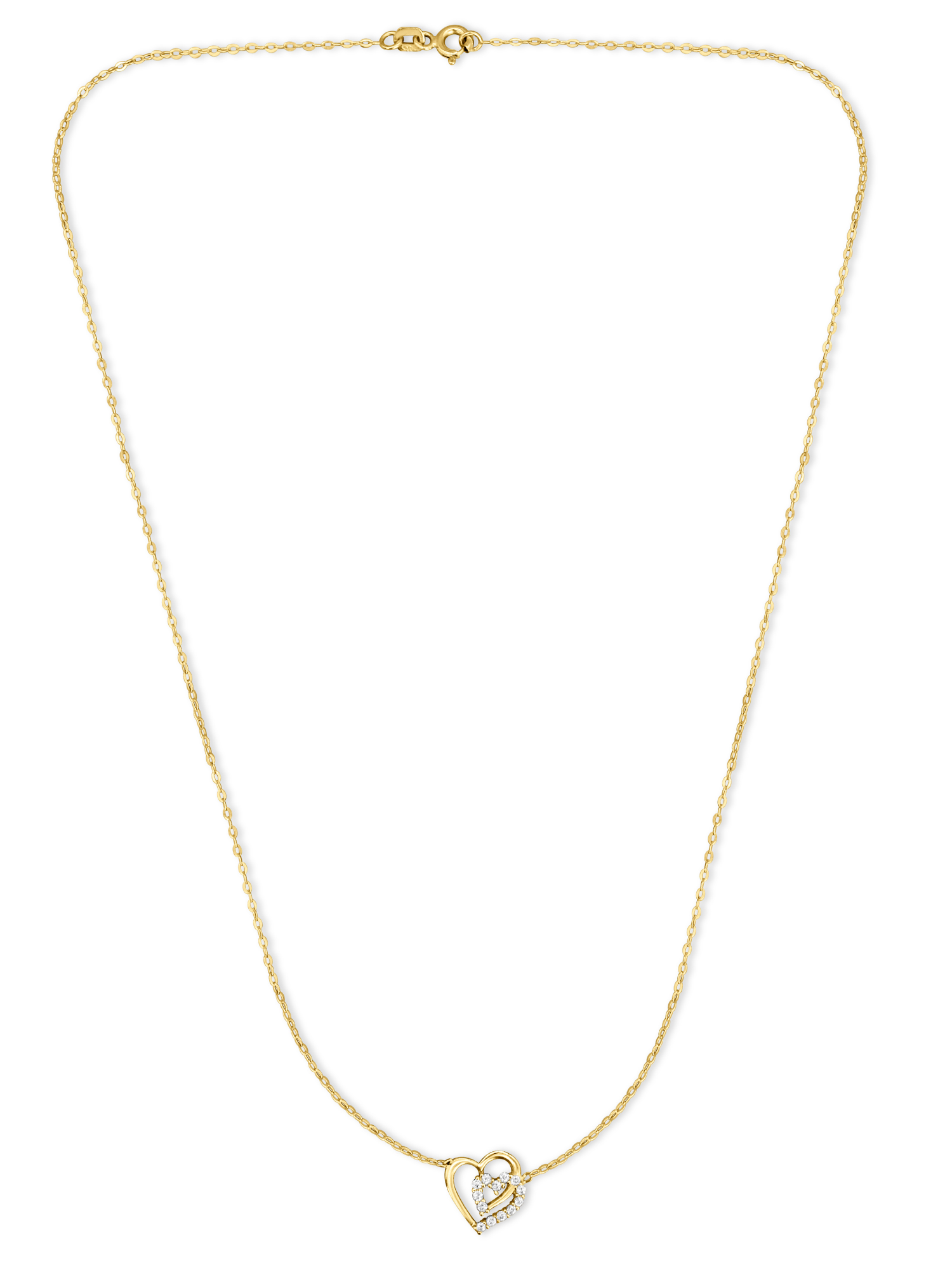 Eines der Herzen ist mit kleinen, präzise gefassten Zirkonia-Steinen besetzt, die bei jeder Bewegung glanzvoll funkeln. Die Kombination aus hochglanzpoliertem Gold und den strahlenden Steinen verleiht der Kette eine luxuriöse Ausstrahlung.